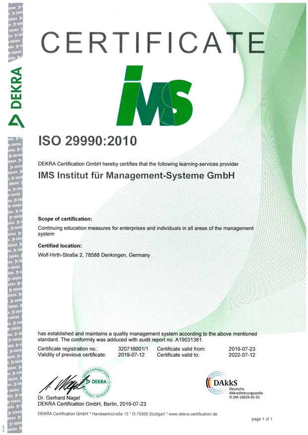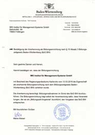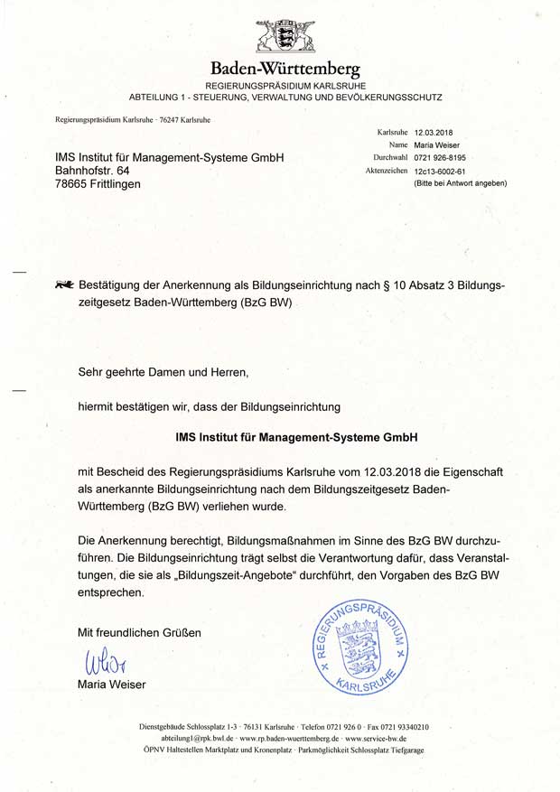 Das Institut für Management-Systeme GmbH ist durch das Regierungspräsidium Karlsruhe als Bildungseinrichtung nach dem Bildungszeitgesetz Baden-Württemberg (BzG BW) anerkannt.