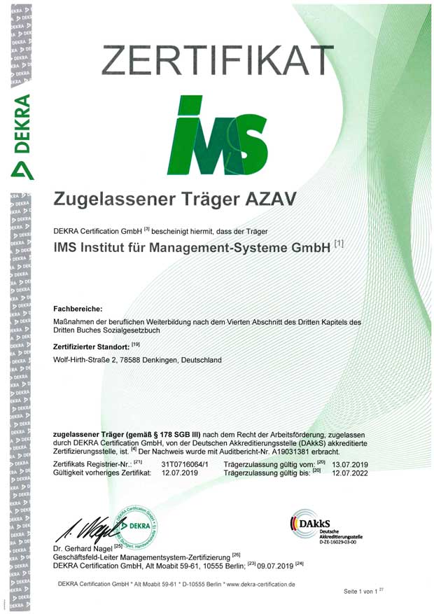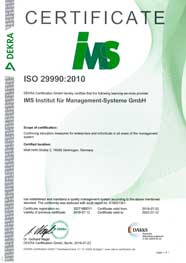 Unser Unternehmen ist selbst nach DIN EN ISO 9001:2015, ISO 29990 und nach AZAV zertifiziert.
